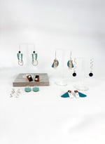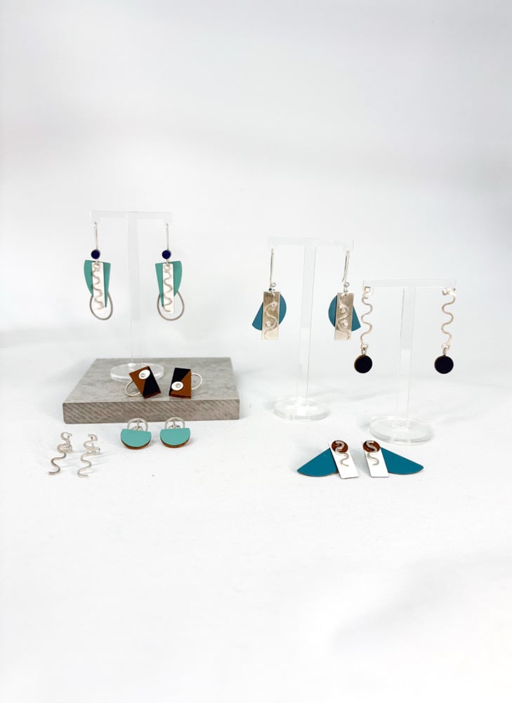 These simply beautiful earrings are created in Silver with Walnut and Formica. Inspired by shorelines and sea landscapes, you can always feel close to the sea