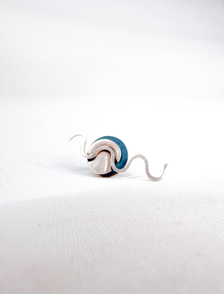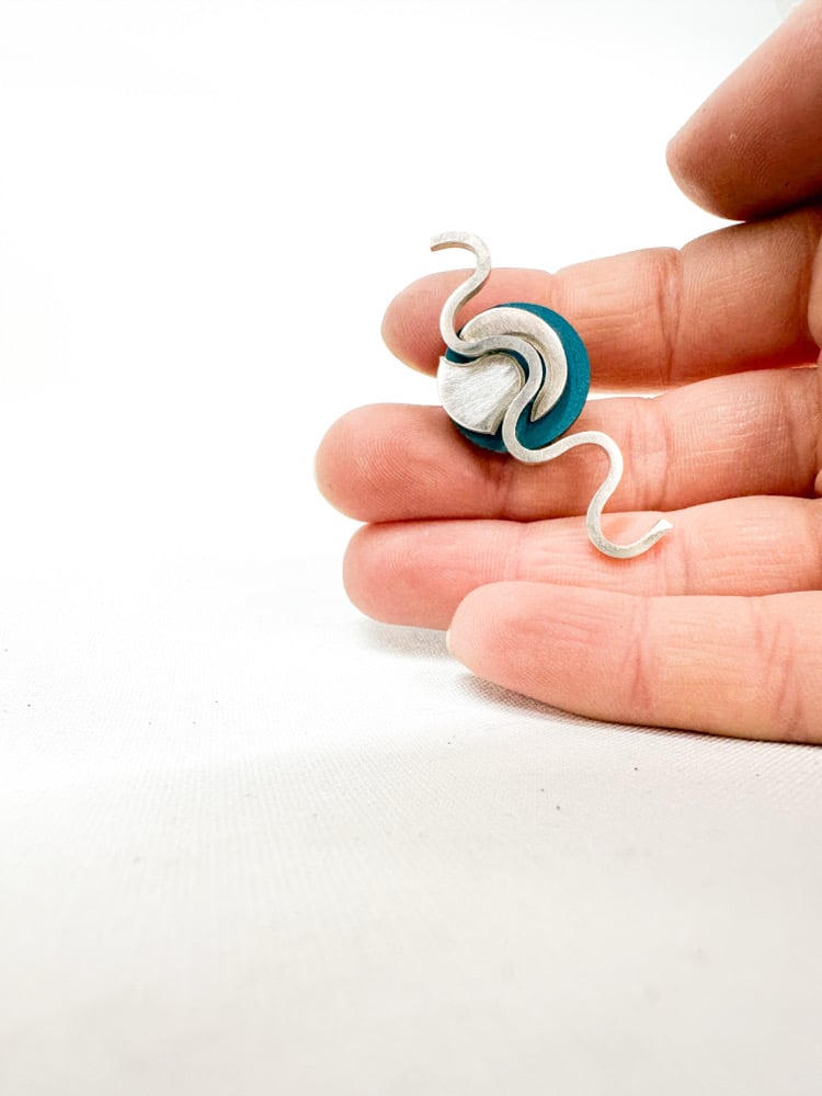 This beautiful pin brooch is created using Walnut and Formica featuring a tideline shape Silver detail. Inspired by coastal shapes and details its composition is bought together by bold geometric shapes and pops of colour.